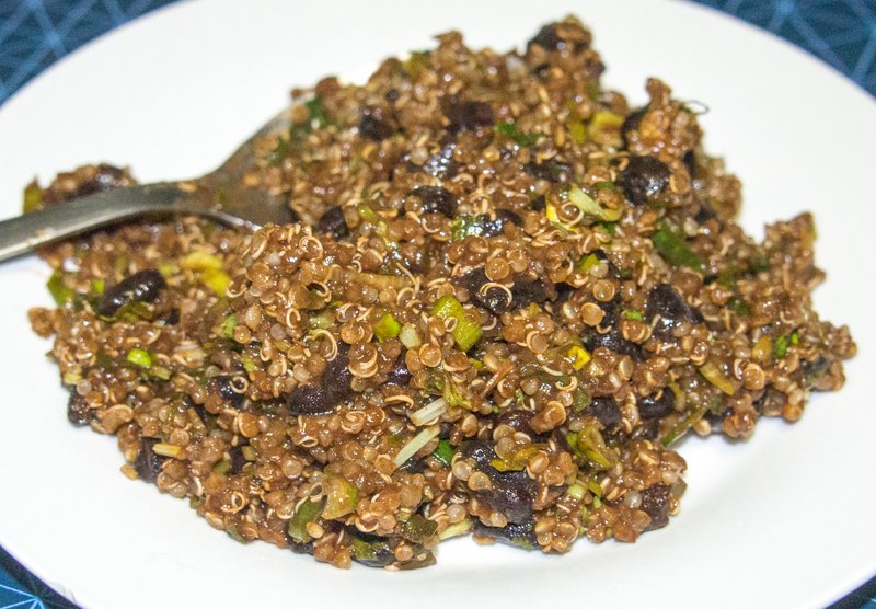 While the beans are cooking, cook quinoa in a rice cooker or pot with approximately 2.5 cups of water until all water is gone and the quinoa is fluffy. Then mix in the beans, either canned or cooked, and the diced jalapeños, cilantro, and garlic. The jalapeños should be deseeded if you are sensitive to spice, but leaving the seeds in provides a delicious kick.