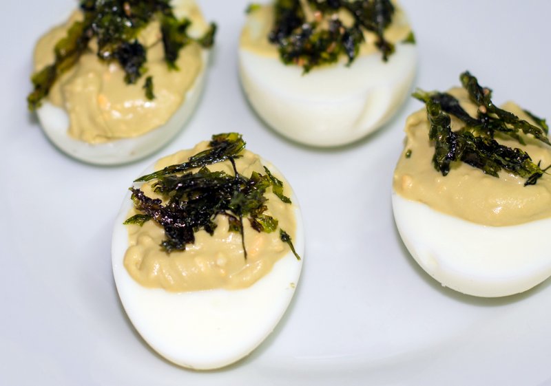 Mix the yolks with the wasabi paste, mayonnaise, and sesame oil. You can adjust the quantity of wasabi paste to your taste. Once you have a smooth paste, scoop a spoonful of it back into each half egg white. Sprinkle with the seaweed flakes and, optionally, sesame seeds. Serve either immediately or after chilling.