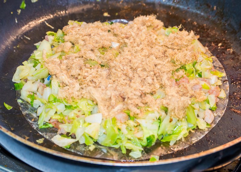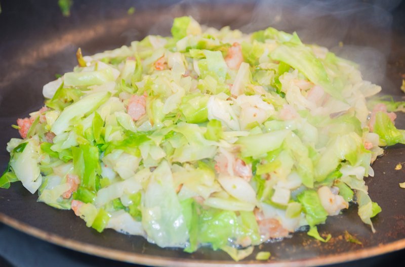 I use frozen miniature shrimp and scallops that are pre-cooked but you can of course use fresh ingredients if you prefer. Mix these with the cabbage. Fry with a bit of vegetable oil in the first frying pan, mixing occasionally to prevent burning, until the cabbage is cooked through and the excess water has boiled off (or simply drain it if there's too much). Set to the side on a plate.
