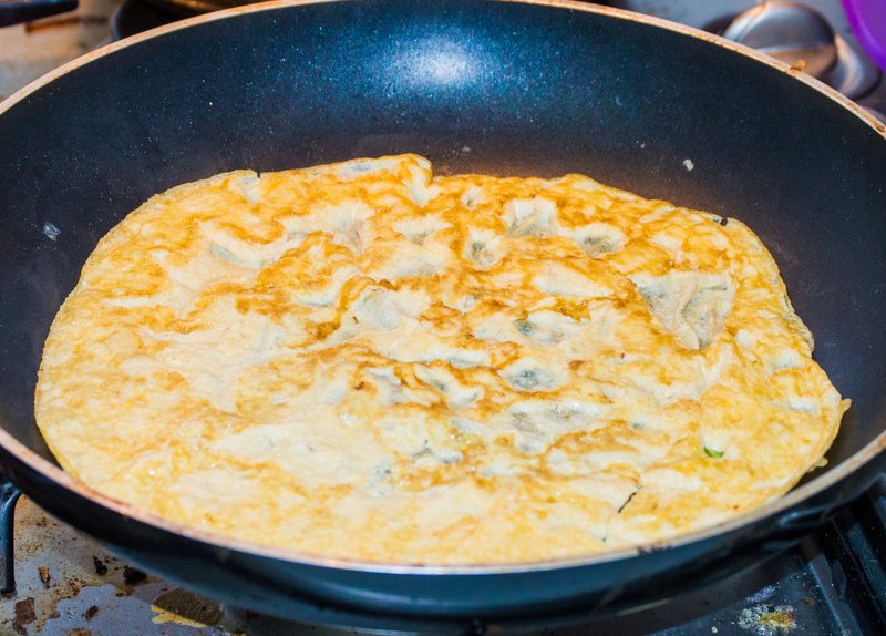 In a cup or bowl, mix up the raw egg/s with a couple tablespoons of water. Oil the first frying pan and pour in the egg mix, letting it spread out into a large circle. Let this cook until solid, popping bubbles as they form so it stays flat. When you can, flip it over and let it cook through. Set this egg pancake to the side on a plate.