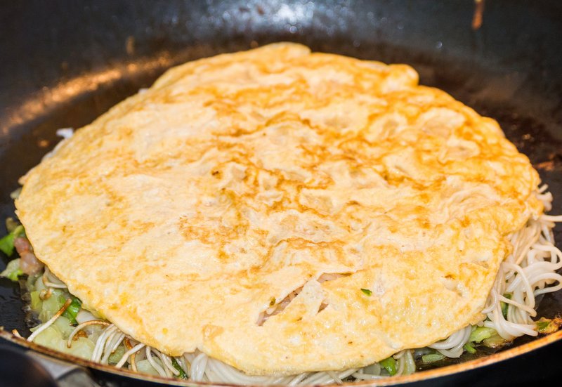 Now, carefully flip the noodle pancake from the 2nd pan on top of the pork fu.