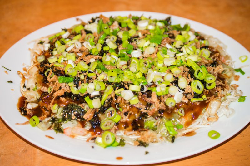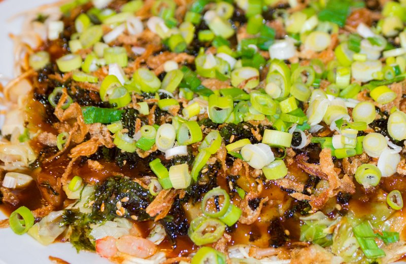 Spread the okonomi sauce or substitute on the rice paper top. Sprinkle on the seaweed flakes, crunchy deep fried onions, and green onion. Enjoy!
