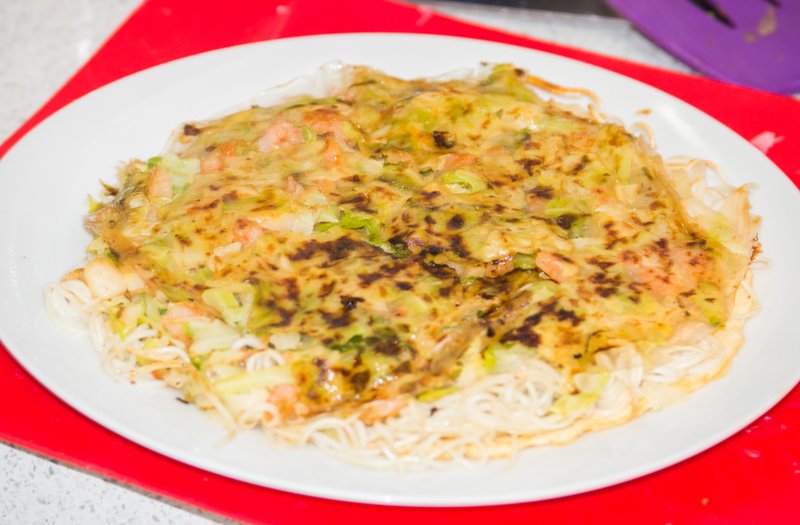 Now, use a plate that is slightly smaller than the frying pan with everything in it and put it, upsidedown, on top of the egg layer. Carefully flip the plate, okienomiyaki, and frying pan over so the plate is now right side up. Very slowly lift off the frying pan, unsticking the rice paper as necessary without letting the whole thing fall apart.