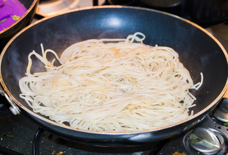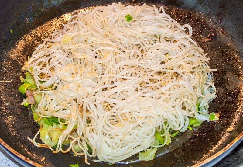 Arrange the boiled noodles into the form of a pancake and fry with a bit of vegetable oil in the second frying pan. When they start to get crispy on one side, flip and let them cook on the other side. Then remove from heat and set to the side, leaving them in the frying pan.