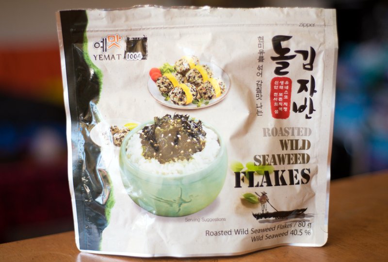Note: Asian food stores have seaweed flakes, and we get the ones pictured below at Costco. In a pinch you can use seaweed wrappers made for sushi rolls by tearing them into very small bits, but the seasoning that comes on the flakes is extra tasty.