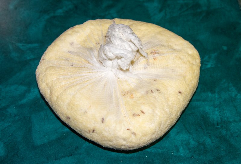 Gather up the corners of the cheese cloth and twist it tight to squeeze out even more liquid. You'll probably have to let it cool for a few minutes first, or use gloves. Twist it up as tightly as possible, and then wrap it in a layer or two of dish cloths. The whey will eventually drip out of the cheese cloth if you put it under weight, but that's a pretty slow process; wrapping it in a cloth absorbs the liquid out much faster and you can have ready-to-eat paneer in 15 minutes. This photo shows the cheese cloth wrapping after I've let it sit in cloth (underneath something heavy) for about that long: