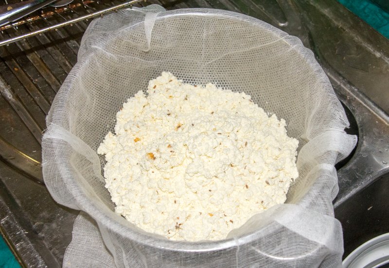 Next, cut a single layer of cheese cloth approximately 2 feet or 70cm square and place this in the bottom of a colander. Drain the curds through the cheese cloth and let as much liquid run out as possible. Some people might tell you that an old thin t-shirt will work, but don't believe them - cheese cloth will make the process ten times easier and about 24 hours faster. It's a little tricky to find in stores anymore (but I do see it in those strange discount stores that seem to mostly sell surplus inventory from 30 years ago) but you can order enough for four batches of paneer on ebay for about $1.50.