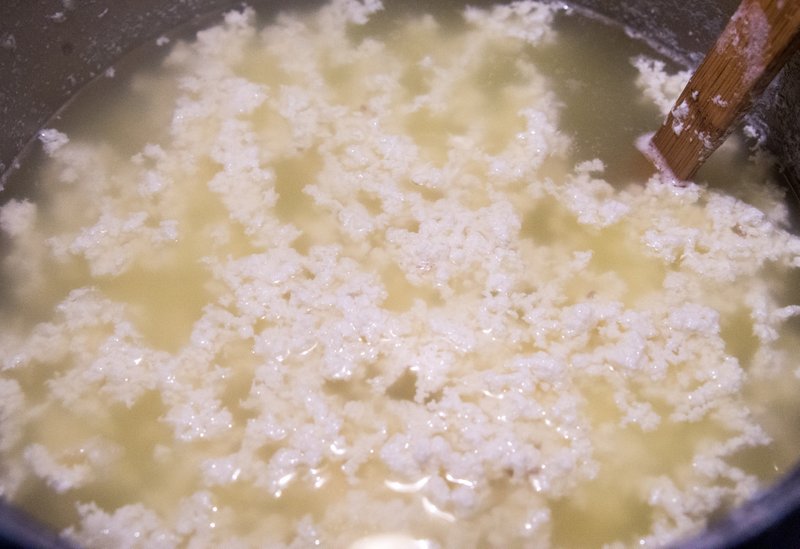 While stirring, add a little bit of lemon juice and white vinegar, in alternating order, a couple tablespoons at a time. The milk should start to curdle right away. If it doesn't, it might not be hot enough, or you might need more acid. You can adjust the ratio of lemon juice and white vinegar to your preferences. The equal mixture give it a nice subtle citrus undertone without getting overwhelming. When no more curds are settling out of the whey (the whey will be transparent at this point), you're done. It will look something like this: