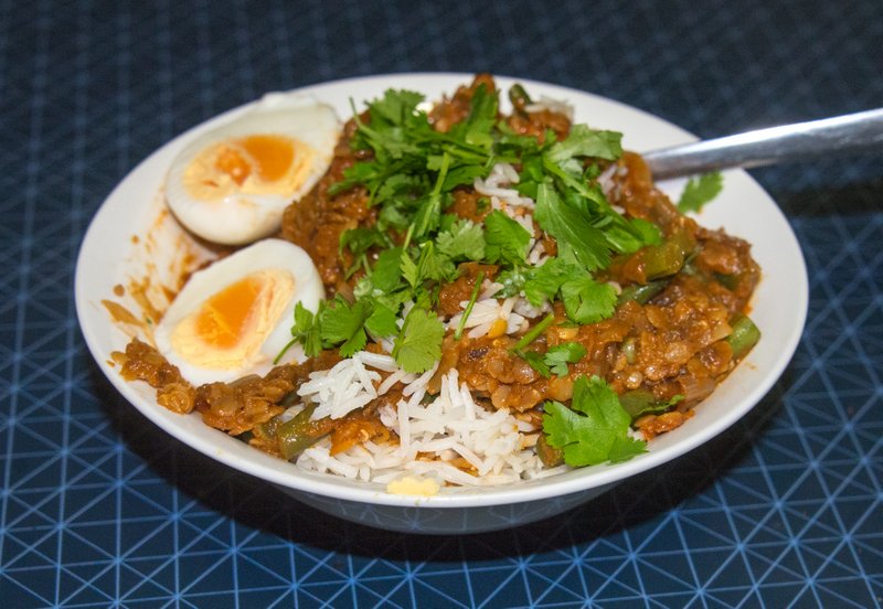Serve with rice (basmati preferred, and cooked with a little salt) and a hard-boiled egg, and garnish with fresh cilantro.