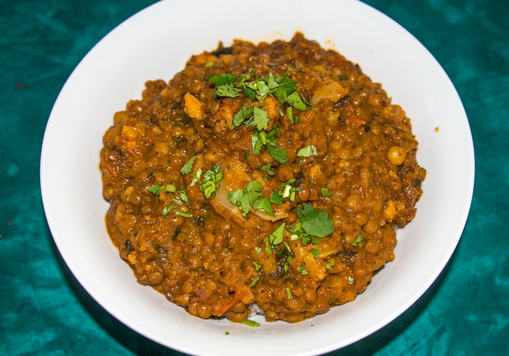 Add the lentils and yellow split peas. Boil in the base until they're nearly soft enough to eat. Add the spinach and cauliflower. Salt to taste. Once the lentils and peas are soft enough to eat (~5-10 minutes), remove heat. You don't want the lentils to be too soft -- they should retain some chewy texture and largely intact skin for the most part.