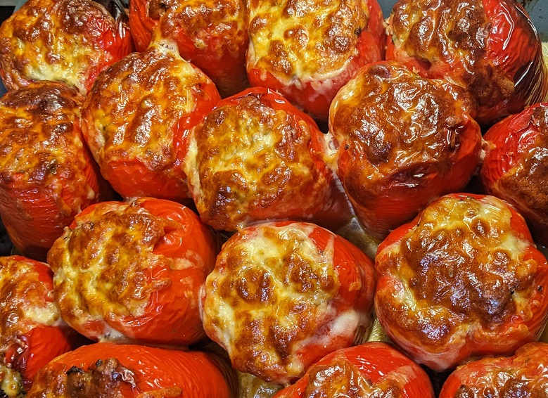 Preheat oven to 165 C and stuff the mixture into the capsicums. Stand them up on a baking tray. Bake for 45 minutes, and then top each capsicum with mozzarella. Increase the oven to 195 C and bake for another 15 minutes until the cheese is golden brown.