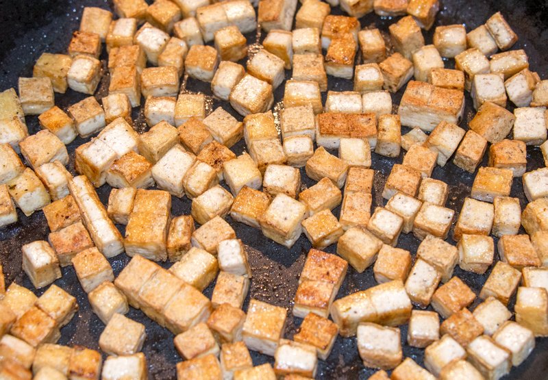 When the bottom of the tofu starts to get golden-brown, it's time to stir it and let a different side of the cube fry. The easiest way is to just mix the tofu into a big mound in the middle of the pan and then shake the pan front-to-back to let the tofu settle randomly flat against the pan. Repeat this process 4-5 times, until most of the tofu's surface is fried and crispy/oily. Depending how crispy you want it, wait longer or shorter to allow for more or less of the moisture in the tofu to boil off.
