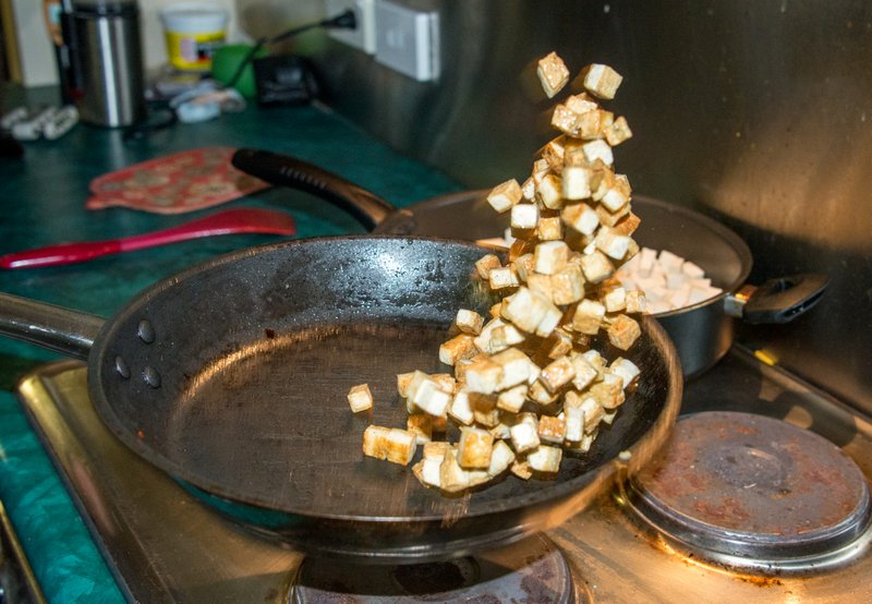 Add the vegetable and/or sesame oil to a large, flat frying pan. Bring it to low-medium heat. Add the tofu (it should sizzle a bit when it hits the pan). Spread the tofu evenly so that as much as possible is directly on the pan surface and as little as possible is touching each other (or it will stick together), and fry for 5 minutes.